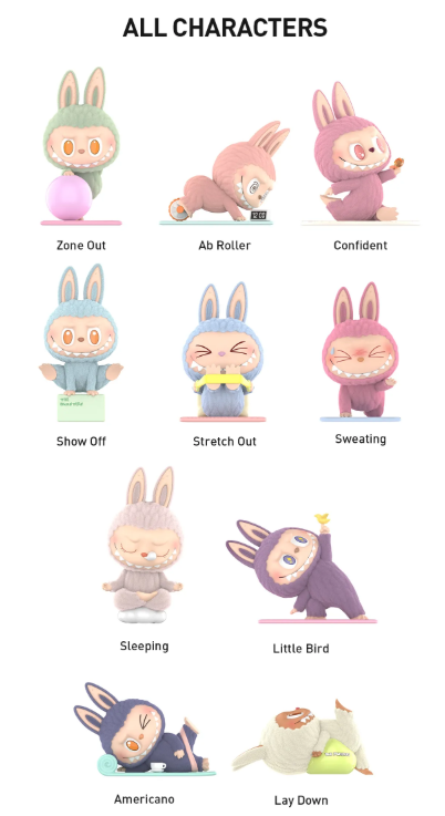 Take a calming breath with Labubu and friends as they try their best to stay flexible... or just stay awake.